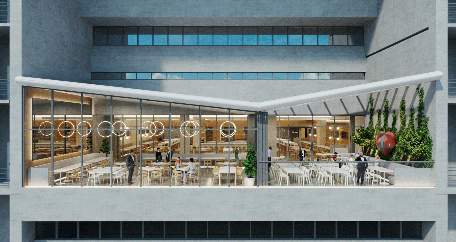 The renderings for this state-of-the-art facility reveal Gordana Jordanovska's unconventional approach. Carefully chosen fixtures like the halo-shaped pendants in the airy "Heroes Lounge" complement the strong architectural lighting, bringing emotion to the space.
