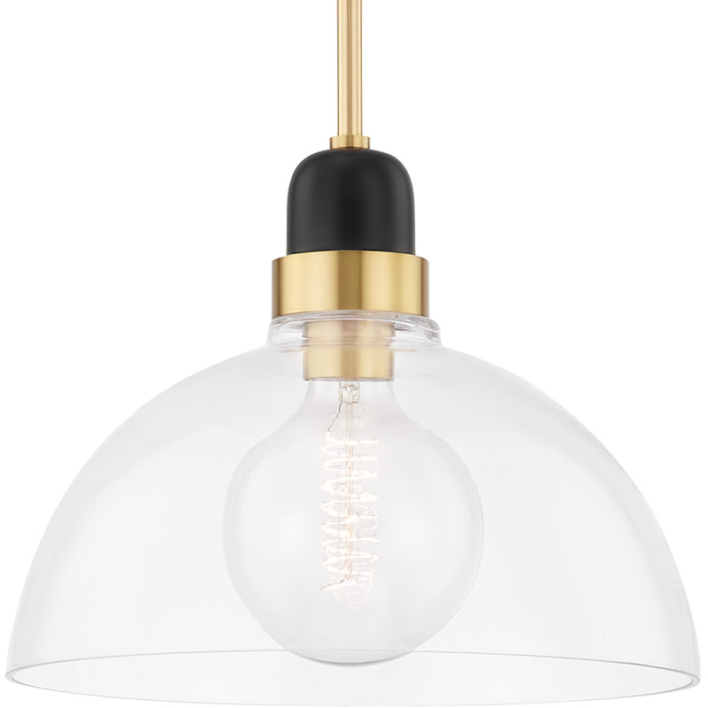 The Camile Pendant offers an industrial-inspired look with a two-tone steel frame and handblown glass shade. The clear shade features a wide opening to allow light to flow freely.