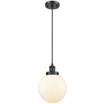 The Beacon 916 Pendant adds a clean classic look to your interior space. The smooth decorative frame is complemented by a smooth glass globe that casts warm shadows across your room. Canopy: 4.75 inch diameter.
