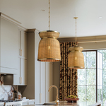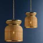 Handcrafted in India, the basket-inspired weave of the Parkchester Pendant highlights the special qualities of natural rattan. Adding a note of shine to the construction, an Aged Brass band cinches the fixture at the top, coordinating with the chunky chain suspension.