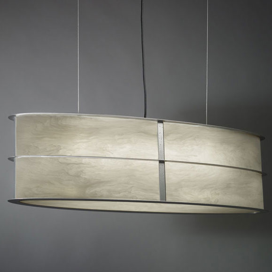 The Ellipse Oval Pendant is a clean detailed piece, perfect in a variety of spaces in your home. The oval acrylic diffuser is available in White Swirl or Opal and surrounded by a frame in Cast Bronze, Black, or Chrome. Canopy: 20 inch x 6 inch rectangle. Damp location rated. Made in the USA. UL listed.