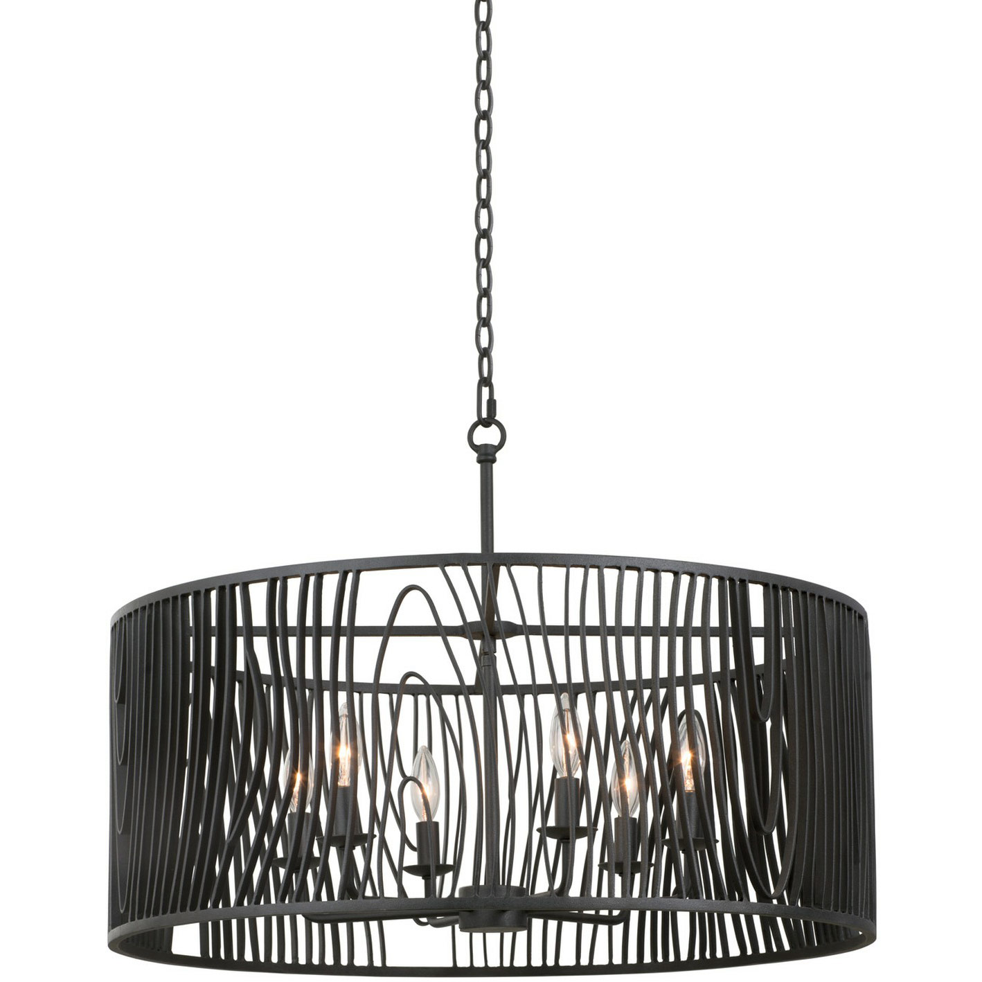 The Morre Pendant offers a chic look, featuring a Black Iron finished cage drum shade that features curving bars that exposes an inner candelabra. Available with six or eight lights. ETL and cUL listed.