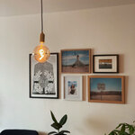 The Voronoi I Pendant features a unique look with a socket in wood or metal paired with the Voronoi I LED Bulb by Tala. The bulb's irregular, organic shape is inspired by the naturally occurring Voronoi pattern seen in giraffes' coats or certain cell structures. A spiraling LED filament, inspired by the Fibonacci sequence, and iron-tinted glass create a warm, amber glow that will enhance any interior.