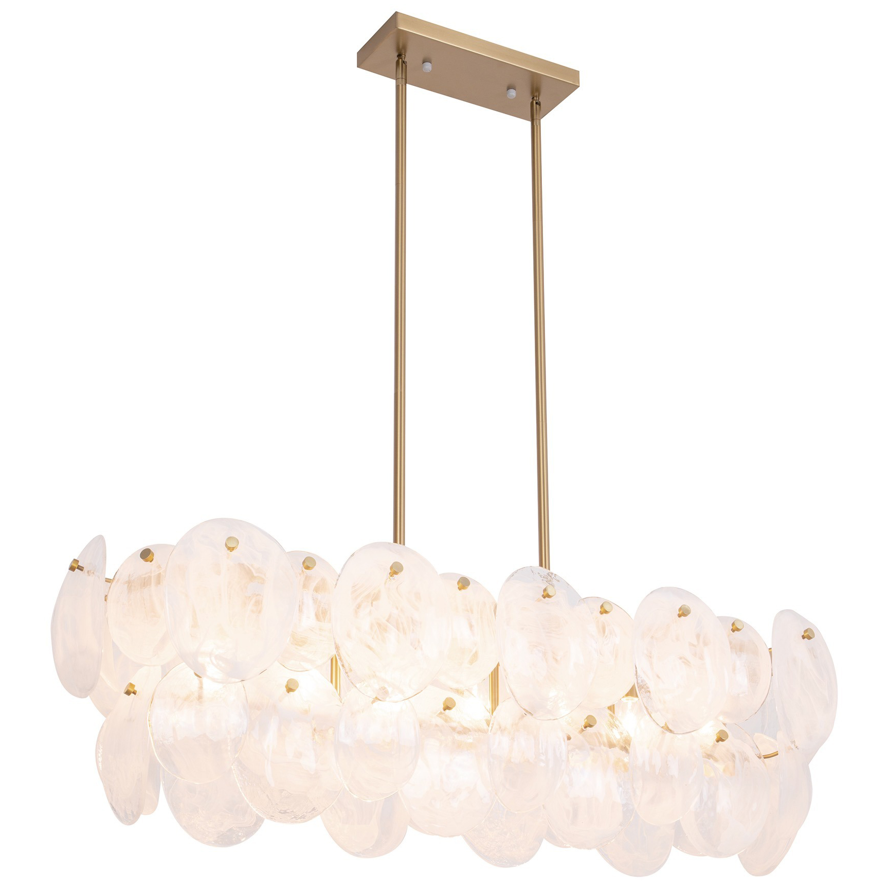 The Lily Island Light exudes a delicate charm, captivating with its Murano-style glasswork in a wispy white finish. Each circular panel dances with subtle elegance, reflecting light in a manner that feels both luxurious and inviting. Complemented by a brushed brass frame, the design radiates a poetic blend of elegance and allure. This chandelier casts a spell of enchantment, illuminating your space with a touch of dreamy opulence.