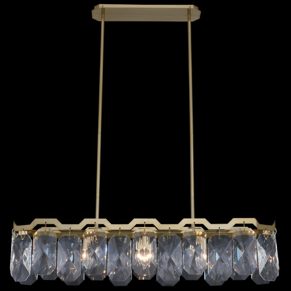 The Piatta Island Light features custom, oversized emerald cut crystals creating a clear view for the curious minimalist. A simple Brushed Brass frame travels along the outline of the crystal for a more edgy feel complete with detailed ring hardware suspending the crystal.