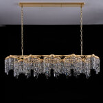 The Cadere Island Light captivates the eye and sparks intrigue with its mesmerizing visual texture. Drawing inspiration from cascading waterfalls, this collection showcases vertical Firenze Crystals suspended from an undulating steel frame. Elegantly finished in gold, it is both stunning and thought-provoking.