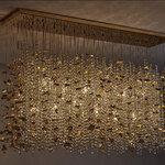 Introducing a sophisticated flush mount light fixture, expertly crafted from stainless steel and adorned with crystals, featuring an elegant 18K Gold finish. This stunning piece draws inspiration from the natural beauty of swirling and floating leaves, incorporating a captivating blend of textural crystals and gleaming gold metal reflectors. Designed with versatility in mind, each strand of this fixture can be adjusted up to 8 feet, allowing you to tailor its appearance to perfectly complement any interior space. Its unique design and luxurious materials make it an exquisite choice for interior designers seeking to add a touch of refinement and artistry to their projects.