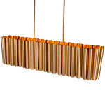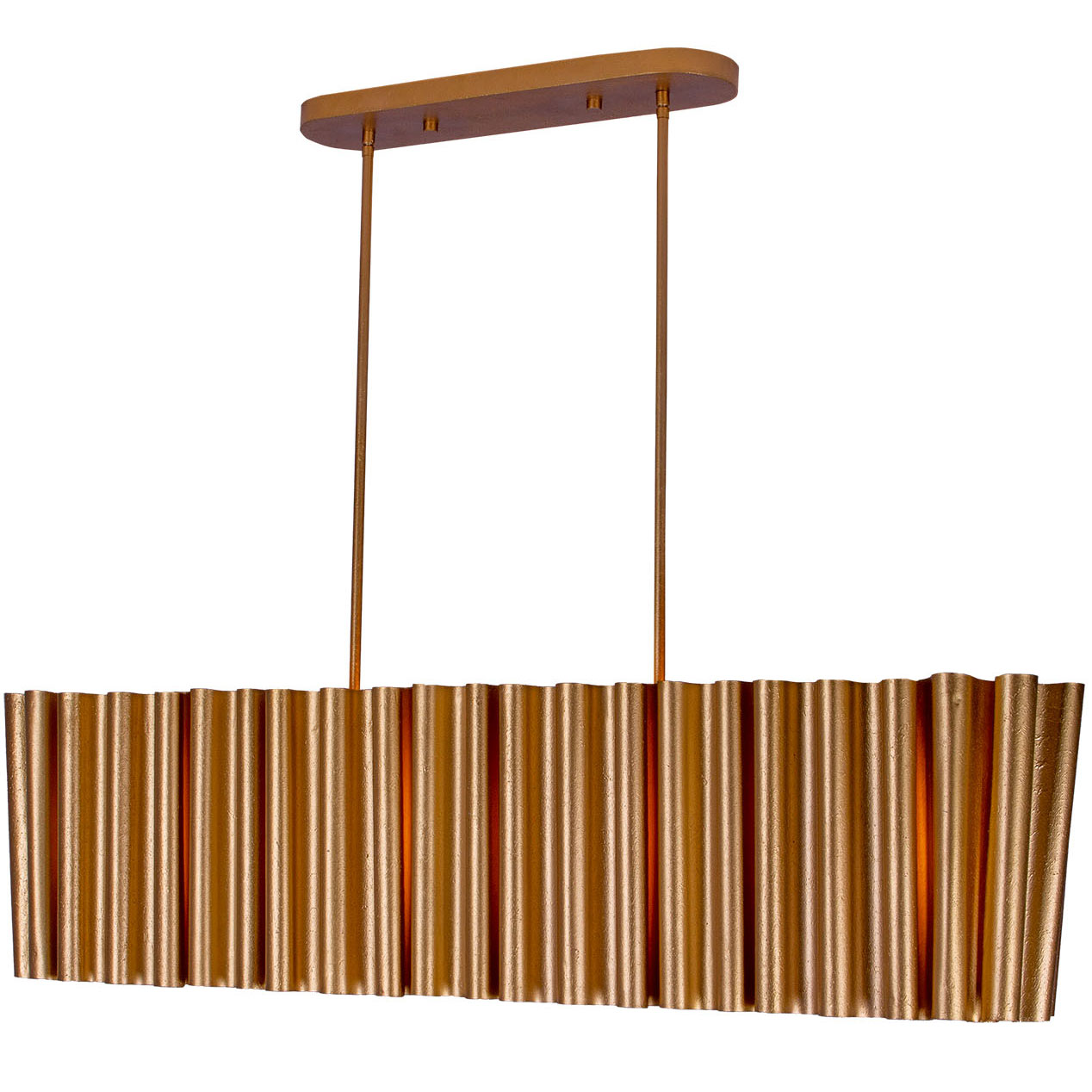 Ripple draws inspiration from textured and formed metal. Offset metal curtains allow for a gentle play of light, showcasing exquisite craftsmanship through its crimped metal surfaces, all elegantly finished in a hand applied Bright Gold.