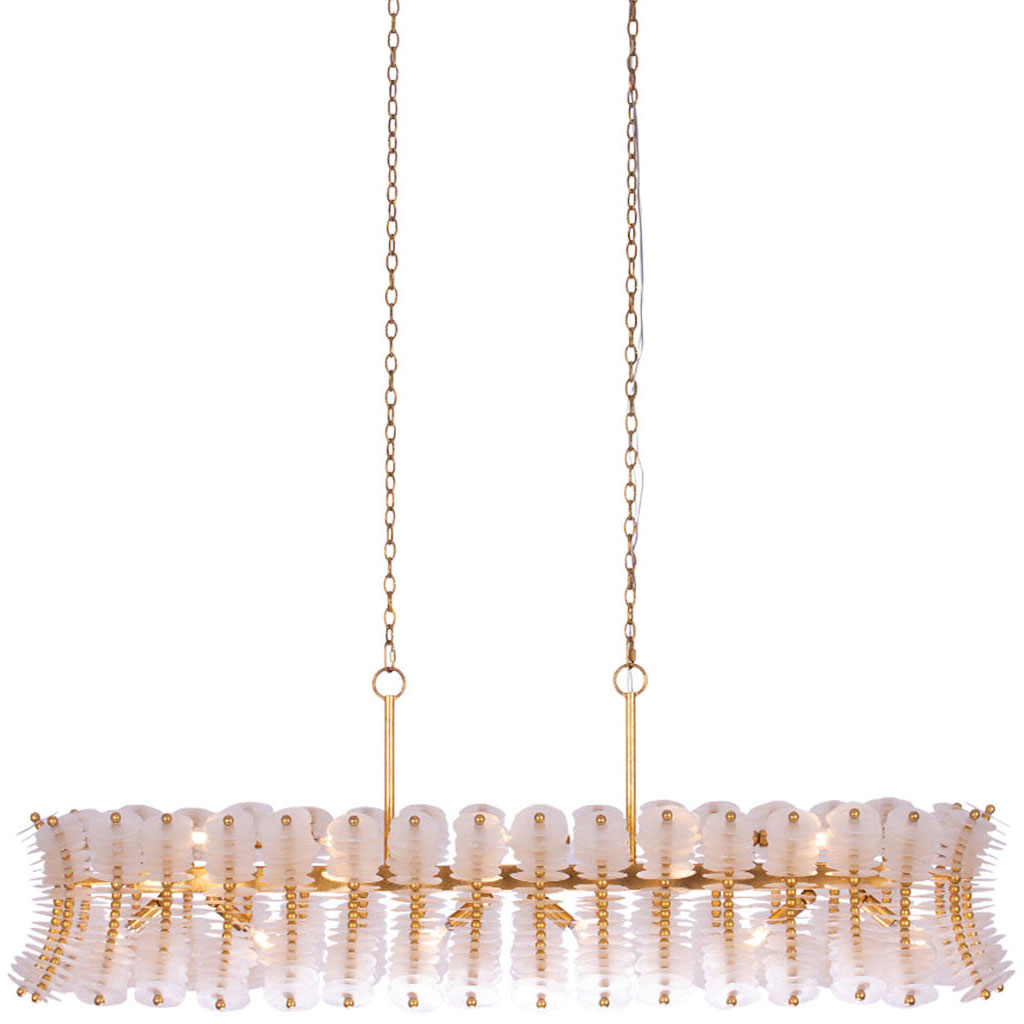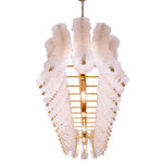The Gossamer Island Light was inspired by ruffled organza silk. Textures of layering flat pieces of raw Capiz Shell show the beauty of their natural edges and the wooden Gmelina bead spacers add structure and visual lines. This soft yet structured design is available in an Oxidized Gold Leaf finish.