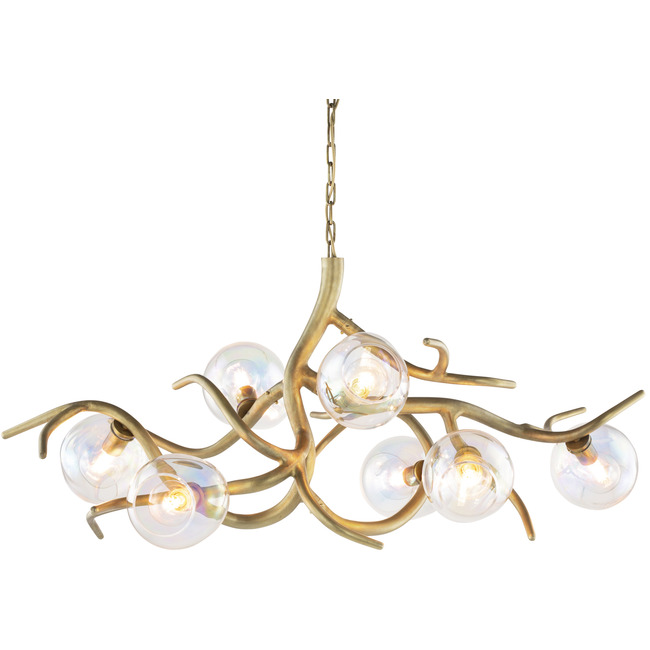 The Ersa Oval Chandelier, named for the Greek Goddess of dew, draws inspiration from natures dew drops formed throughout the night and glistening in the first rays of light. This sculptural masterpiece brings organic shaped glass and sinewy branches of metal to your space. Available in four sizes. Each fixture is a unique, hand crafted piece, and comes with a certificate of authenticity. NOTE - The two largest sizes require a special rated junction box for fixtures weighing over 50 pounds.