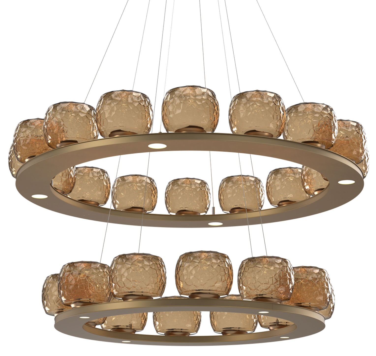 The Vessel Two Tier Chandelier brings a clean fusion of a geometric form and organic design to your interior space. The smooth dual frame holds decorative glass diffusers and casts a captivating play of light shadows across your room. Adjustable cables allow you to place the rings to your desired look.