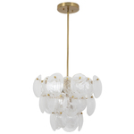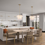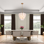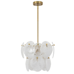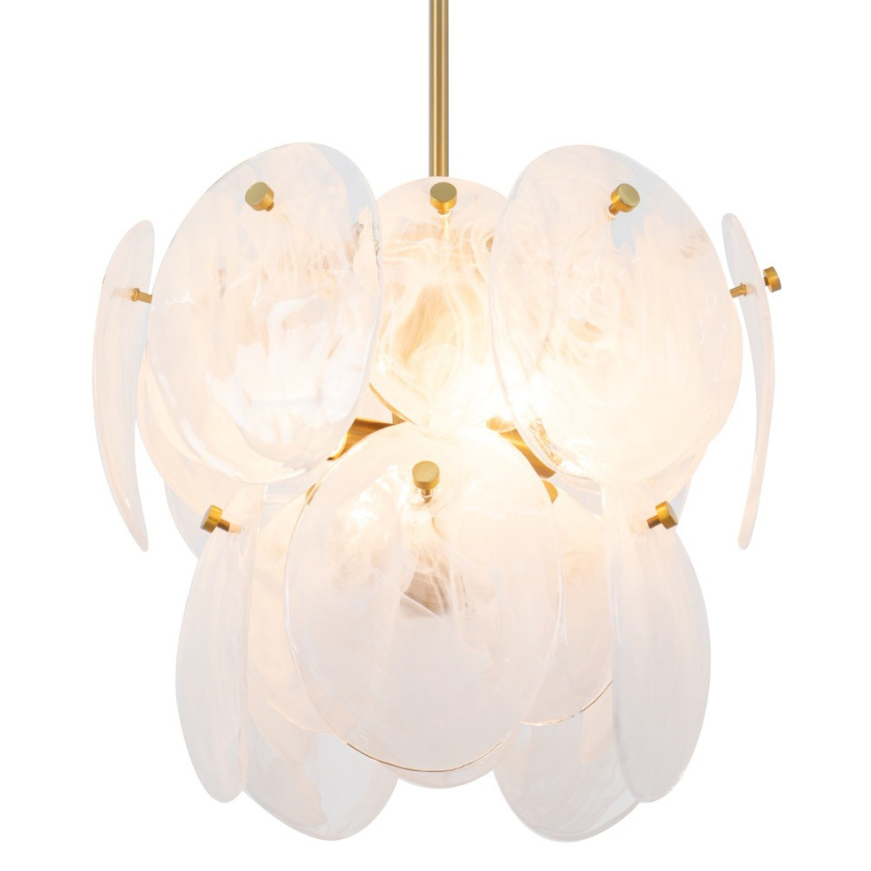 The Lily Chandelier exudes a delicate charm, captivating with its Murano-style glasswork in a wispy white finish. Each circular panel dances with subtle elegance, reflecting light in a manner that feels both luxurious and inviting. Complemented by a brushed brass frame, the design radiates a poetic blend of elegance and allure. This chandelier casts a spell of enchantment, illuminating your space with a touch of dreamy opulence.
