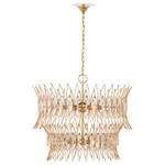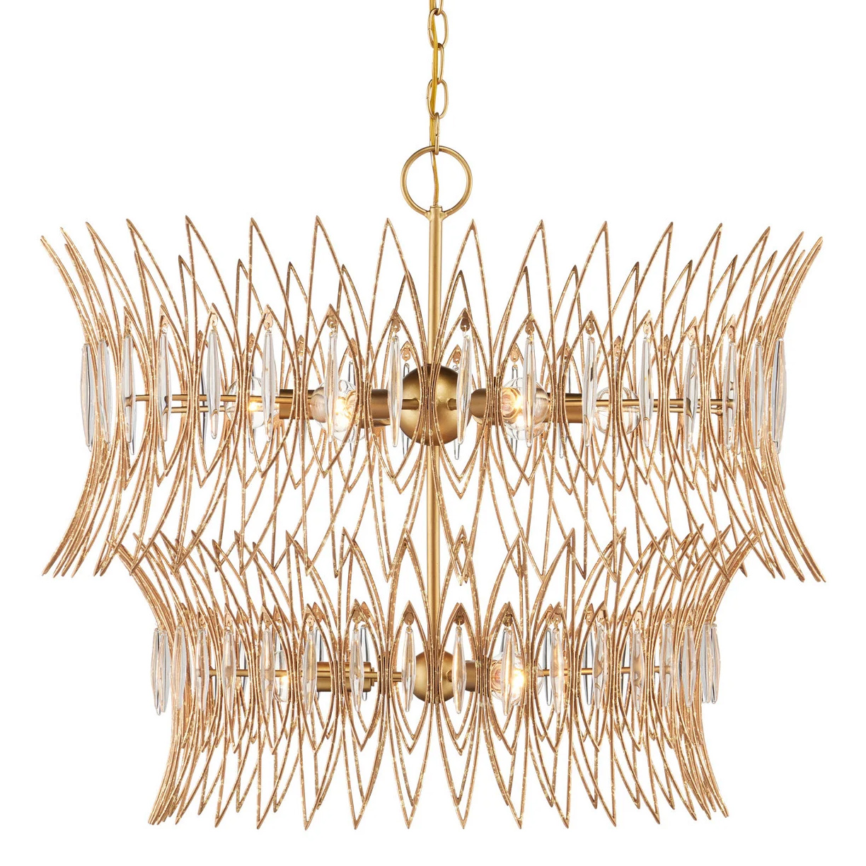 Inspired by mid-century era jewelry, the Marquise Chandelier is made of tiers of slender wrought iron wires woven in a stunning repeated motif. A a Luxor gold finish adds a speckled texture, enhanced by oblong clear glass that seems to sparkle when illuminated.