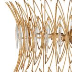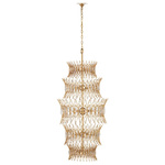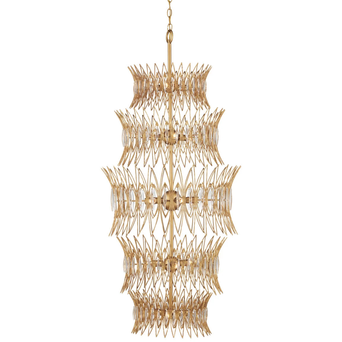 Inspired by mid-century era jewelry, the Marquise Large Chandelier is made of tiers of slender wrought iron wires woven in a stunning repeated motif. A a Luxor gold finish adds a speckled texture, enhanced by oblong clear glass that seems to sparkle when illuminated.