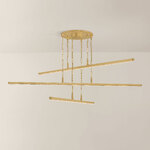 Inspired by a modern mobile, Cortina's linear bars dangle from a complex marionette suspension. Beneath the frame, cast piastre glass with a subtle optic texture adds interest to the streamlined fixture. As a 3-light chandelier, Cortina can serve as a piece of functional art in a grand entryway.