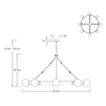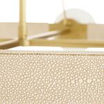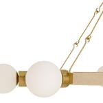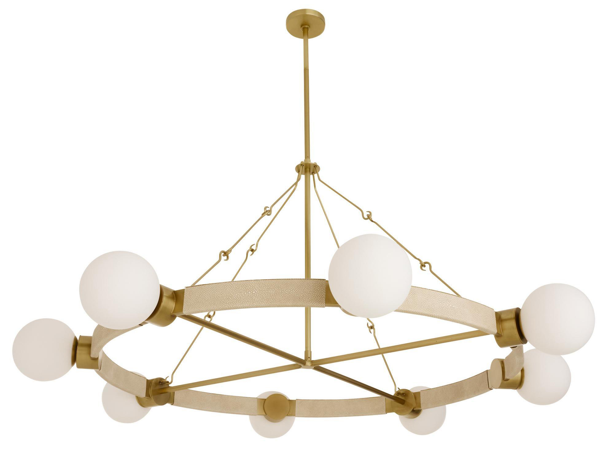 The Liberty Chandelier is inspired by the lighting found in upscale theaters. The hooks of the frame are complemented by globes glass on a ring covered with hand stitched sleeves of faux shagreen leather.