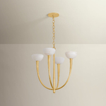 The Maywood Chandelier is an ethereal conversation piece replete with otherworldly beauty and futuristic metalwork. The arms taper as they stretch upwards, finished in Vintage Gold Leaf. At the end of each stem' is an onyx shade that glows with rich natural veining.