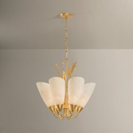 Cloud seedy glass shades bloom around a bouquet of decorative leaves' in the poetic Forest Glen Chandelier. Finished in Vintage Gold Leaf, the frame is elevated by hand-etched details, creating organic veining that looks true to nature. Forest Glen creates an inviting lighting experience wherever it is placed.
