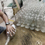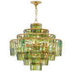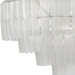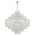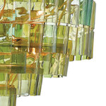 Sommelier Chandelier is made of individually-cut pieces of frosted glass sourced from recycled bottles. Each piece is textured and unique in its own way and is enhanced by the frame's bright Silver or Gold Leaf finish. Eight 60 watt, 120 volt B10 Candelabra base incandescent bulbs are required, but not included. 27 inch round x 26 inch height.