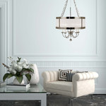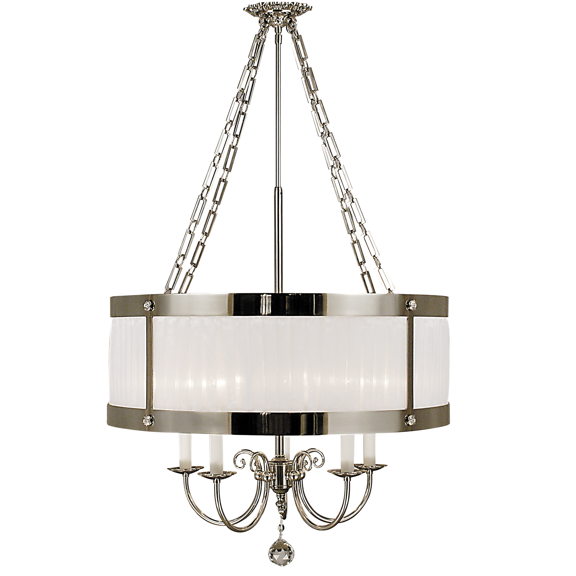 The Astor Chandelier offers just the right amount of added details to update this classic look. The chunky chain and decorative canopy add to the appeal. Features a White sheer pleated softback shade, White candle-holders, Polished Silver finish and a decorative cut Crystal finial. Canopy: 5 inch diameter. UL/CUL listed. Made in the USA.