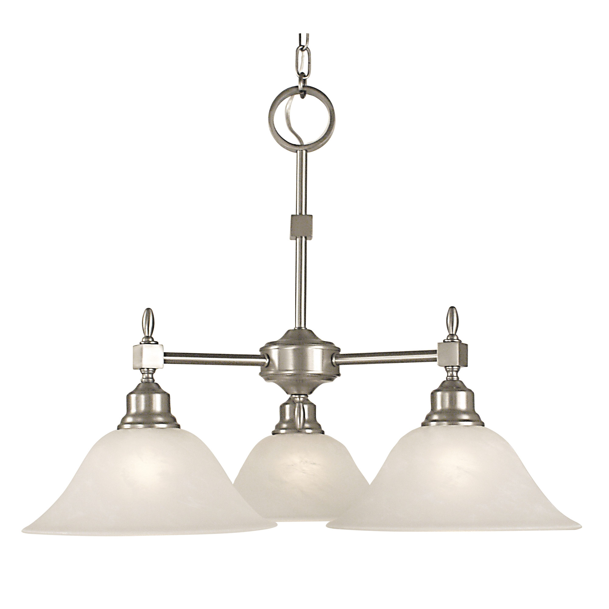 The Taylor Trio Chandelier offers a traditional styled chandelier that is suitable for a variety of decors. Features three dome shaped shades of Amber Marble, Champagne Marble or White Marble glass with Antique Brass, Brushed Nickel. Mahogany Bronze, Polished Brass or Siena Bronze finish. Canopy: 5.38 inch diameter. UL listed. Made in the USA.