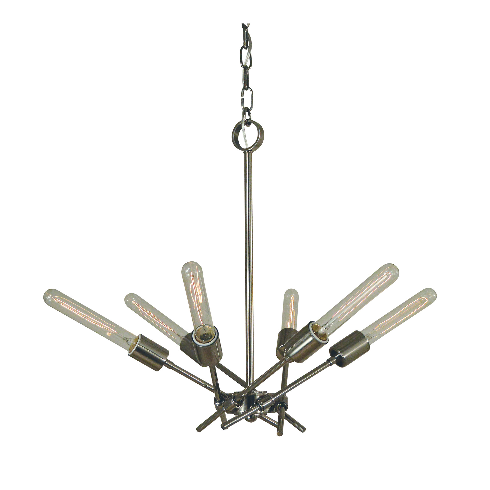 The Quasar Chandelier is a midcentury modern burst of energy. This fun and whimsical chandelier can be that statement piece that your space is missing. Hang multiple pieces to create additional flair. Available in Polished Nickel or Satin Brass finish. Choose from six or eight light option. Canopy: 5.38 inch diameter. Made in the USA.