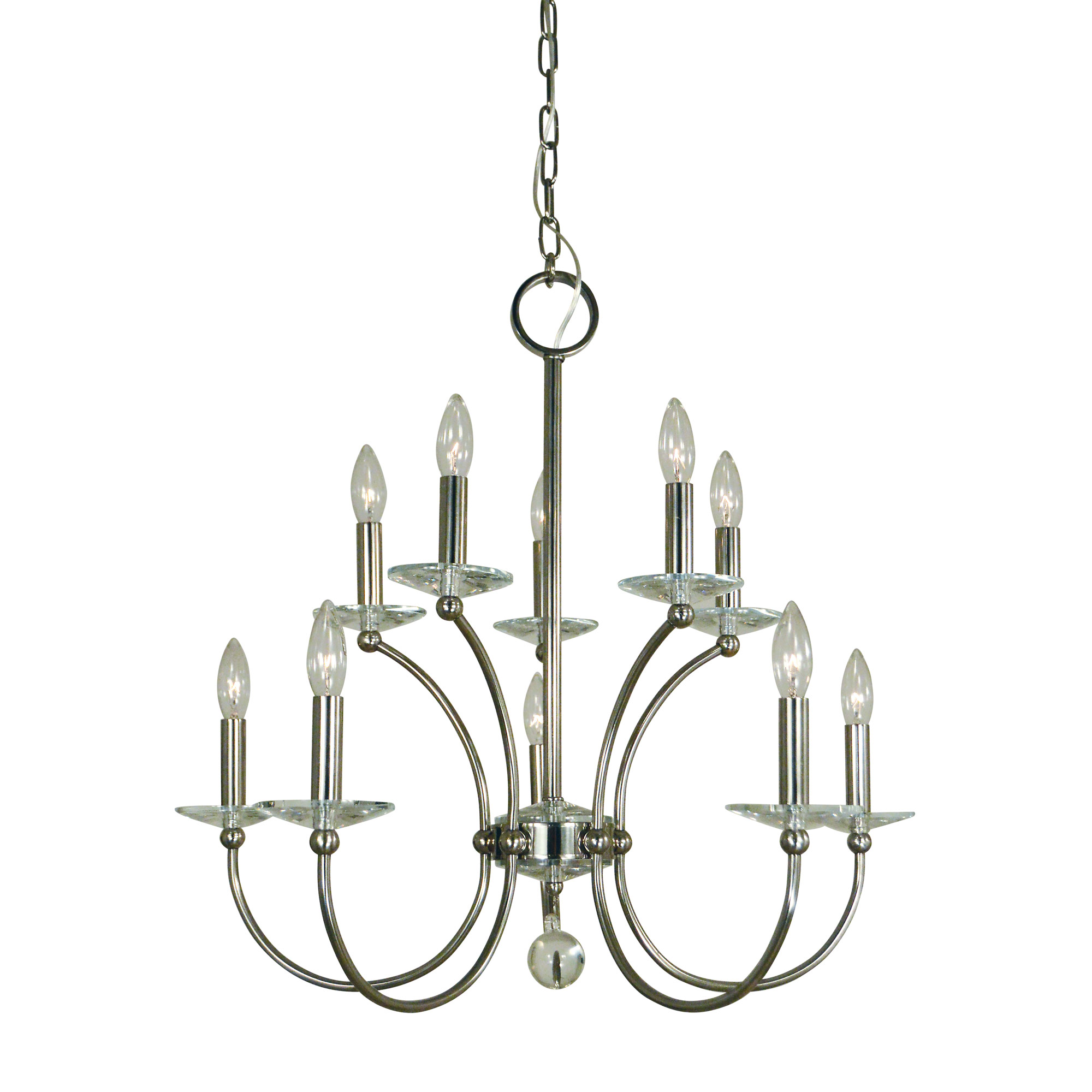 The Pirouette Two Tier Chandelier offers a modern and sleek design with just the right amount of details. Features Polished Nickel finish with Clear bobeches and a Clear glass sphere detail. Canopy: 5.38 inch diameter. UL listed. Made in the USA.