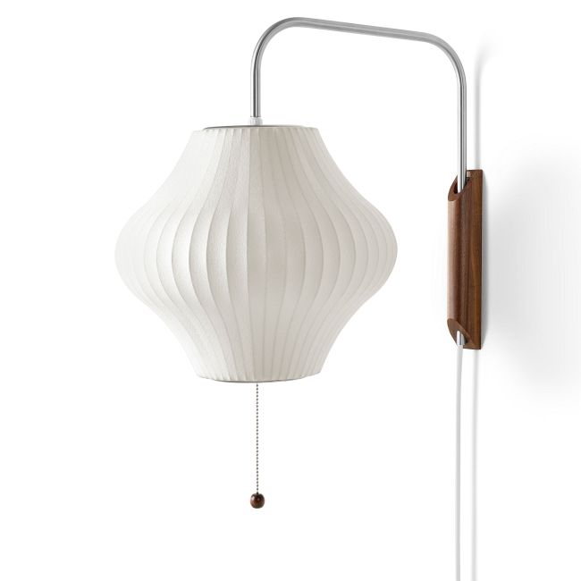 The George Nelson Bubble Lamp Pear® Wall Sconce is constructed with a 2 inch thick solid walnut wall mount and a Brushed Nickel steel arm. Shade is a taut White plastic coating over a steel wire frame. The arm has a swivel hinge and an adjustable 12-foot plug-in cord with a counterweight that allows for height adjustments. This clever design allows one to adjust the sconce from left-to-right, and up-and-down, without having to change its position on the wall.