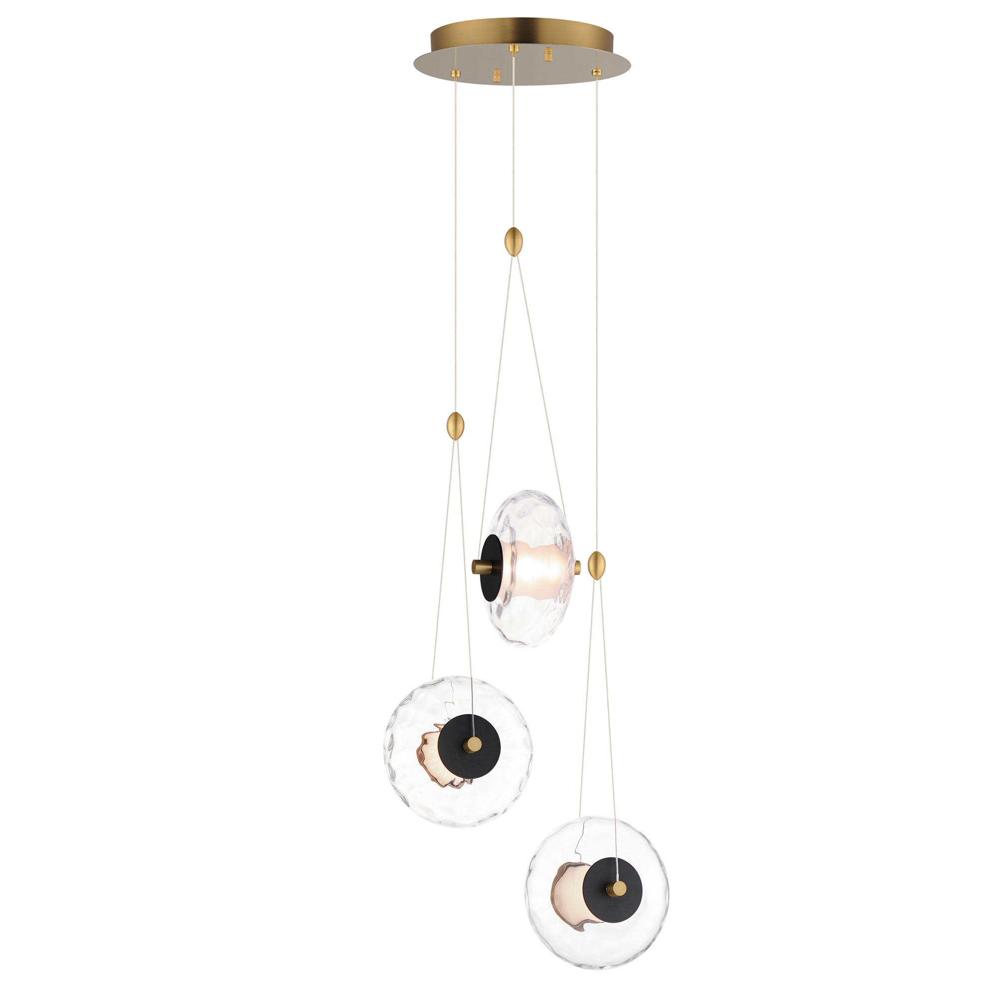 Circular bands, like ornaments, descend from thin low voltage cables in the Amulet Multi Light Pendant. An evenly diffused LED tube spans the distance of the circular wavy glass shades creating a dazzling lighting effect.