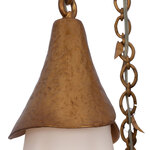 Drawing inspiration from flowering vines, the Bougainvillea brings a delicate and welcoming charm to your decor. Its frosted, water-textured glass, coupled with an ornate chain adorned with decorative leaves in a Warm Gold finish, emits a romantic radiance. The piece is completed with a handcrafted hammered steel canopy and glass holder, adding to its artisanal allure.