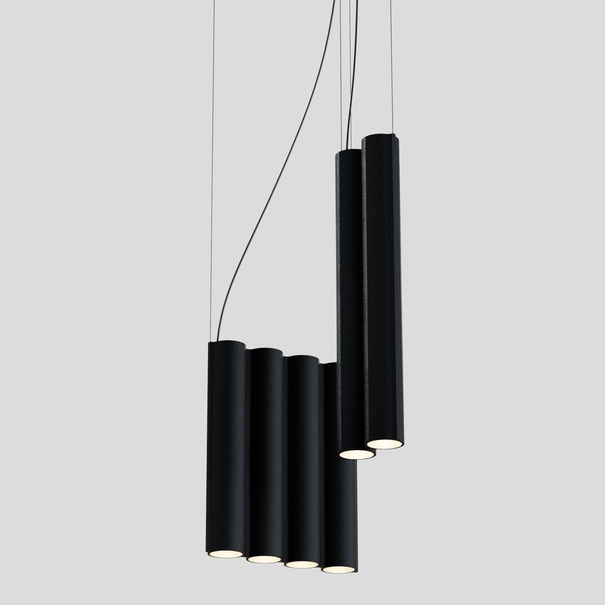 The Silo 10 Multi Light Pendant offers a theatrical but sleek look thanks to its array of extruded aluminum cylinders. Silo's curving shape creates a rhythmic expression that adds a contrast to the pendant's rigid aluminum construction. In this composition, multiple pendants are suspended together to create an intriguing display. ELV / 0-10V dimmable.