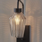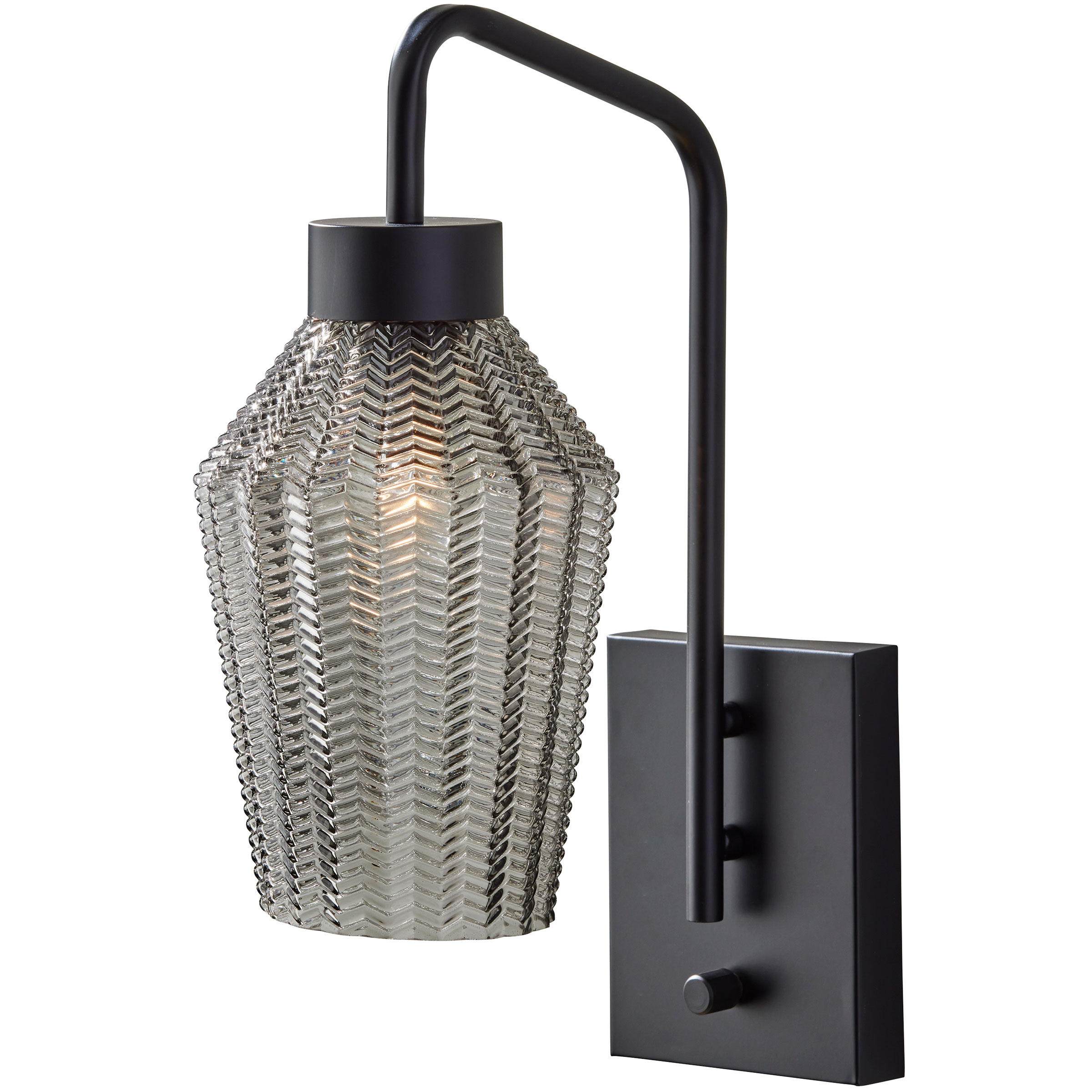 The Belfry Wall Sconce offers a contemporary take on a classic lantern design. An angular black frame supports a lantern-shaped shade of textured smoked glass. On/off rotary switch installed on backplate.