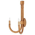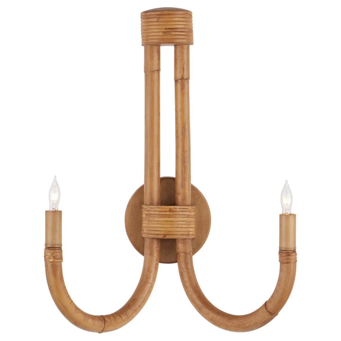 The Samsara Wall Sconce is crafted from thick reeds of rattan that softly curve outward in two arms. The sleek candle sleeves and hardware are in a finished in a saddle tan color to match the natural rattan. This dynamic piece is perfect for a coastal or bohemian home.