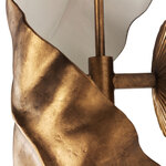 The Spira Wall Sconce showcases intricately twisted and artfully contorted hand-forged steel, designed to emulate the form of a grand, desiccated leaf. Highlighting the delicate vein patterns with a sophisticated blend of Antique Pearlized Brass and White finishes.