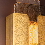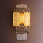 Reminiscent of an elevated jewelry clasp, the Telluride Wall Sconce creates architectural interest through the layering of specialty metal and glass. A panel of watery topaz piastre glass overlays a ribbed clear piastre panel, resulting in a compelling mix of texture and color. A cast metal holder in a Vintage Brass finish anchors the piece with a sense of modernist, graphic style.