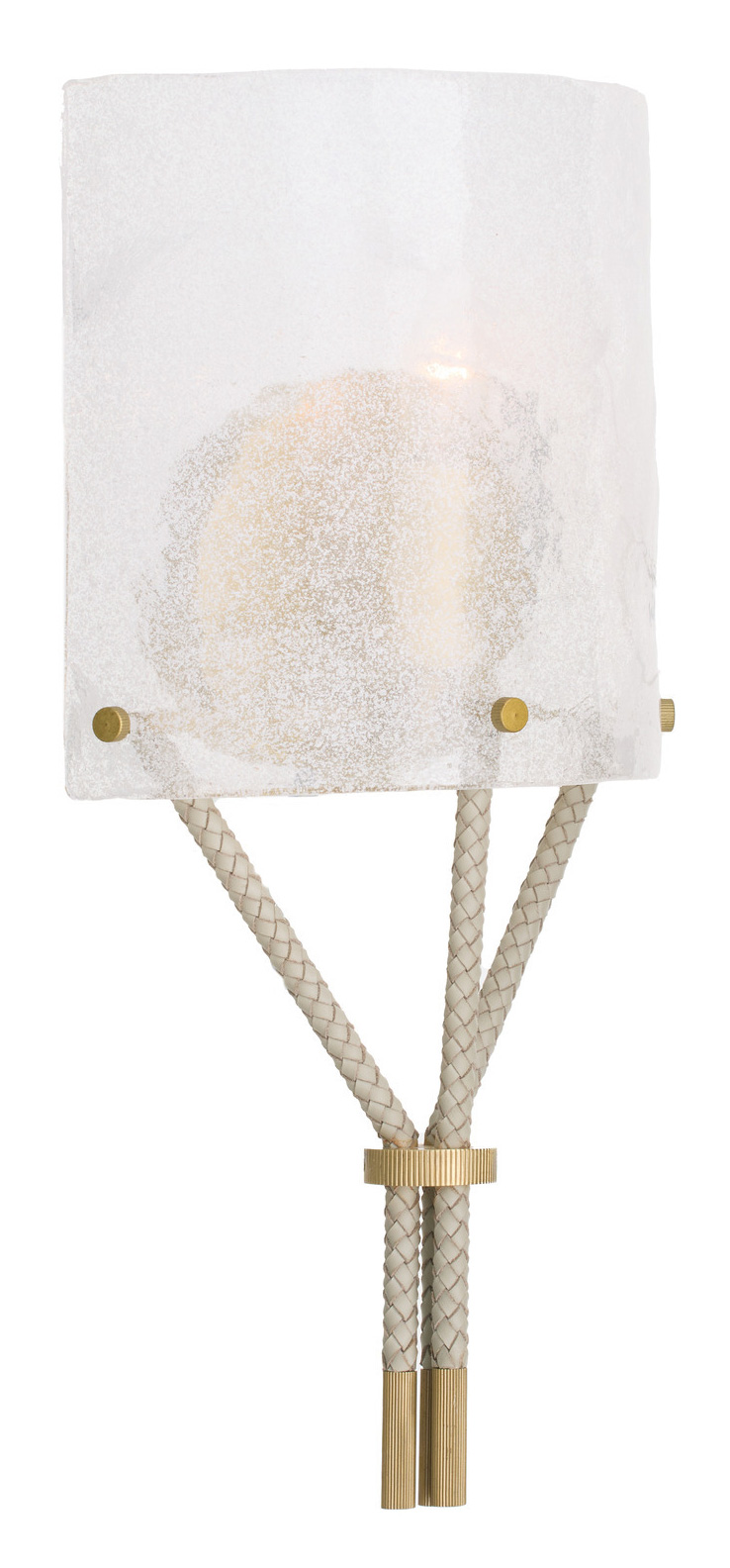 The Lucien Wall Sconce brings a subtle beauty to your interior space. A trio of braided bone leather ties extends from an antique brassplated steel frame, holding a seeded glass face plate that casts a soft, diffused glow across your room.