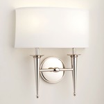 Designed and produced by AYRE Lighting, the Siena Duo ADA Wall Light offers a classic look that will add a touch of sophistication to any space, featuring a wide White shantung tapered shape set into a refined Polished Nickel finished duo candleholder base and backplate.