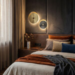 The Eclipse Wall Light features an LED plate hidden between two brass discs. Available in two sizes. Choice of Polished or Satin Brass, Copper, Graphite, or Nickel. Select color for top disc and finish for bottom disc. Dimmable via Triac dimming.