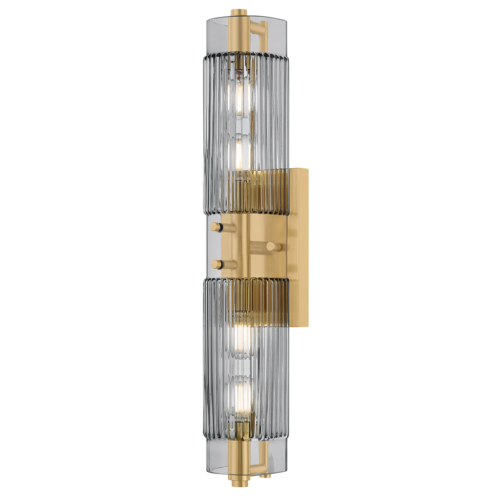 The Duoro Bathroom Vanity Light is composed of totemic sections that make a shimmering sculptural statement on the wall. As light diffuses through the clear smoked piastre glass, the shades cast a warm glow that softens the edges of your relaxation space. A vintage brass frame glows gently within, providing an antique touch. Duoro is an ambient addition to any bath or vanity.