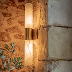 The Barkley Wall Light features a pair of cylindrical genuine Alabaster shades connected by a metal ring to create an impressive silhouette with an overall chic look. Suitable for damp locations.