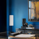 The Paza Table Lamp offers an unobtrusive silhouette that will enhance the furnishings around it. A straight metal frame contrasts with the white cylindrical glass shade. With its modest footprint, it's suitable for kitchens and hallways of all sizes, or as an accent lamp in any room. Includes on/off switch on cord.