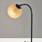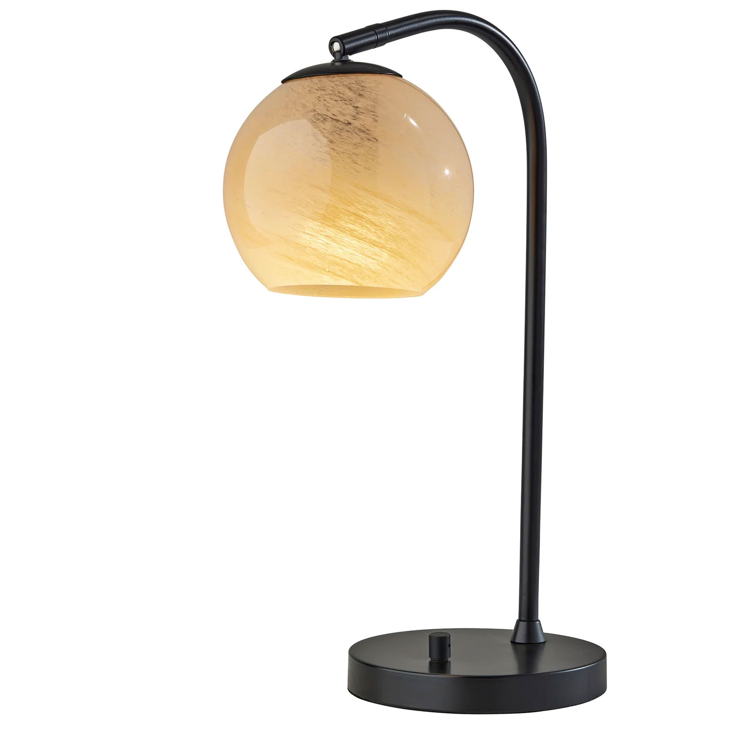 Add warmth and timeless style to your space with the Nolan Table Lamp. The arcing design of this desk lamp makes it the perfect light source on desks, nightstands, and end tables. A round base crafted of black metal supports a slender arcing stem, and suspended from the stem is a stunning glass globe with an eye-catching beige swirl pattern that throws warm light. For versatile lighting options, an articulation point at the base of the glass globe allows you adjust the shade, directing the light wherever it's needed. With a discreet black rotary switch located on the base, it is easy to turn the lamp on or off.