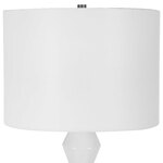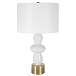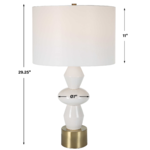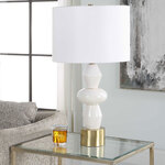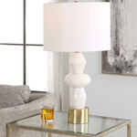 The Architect Table Lamp showcases a towering build of ceramic components in an ivory gloss glaze complemented by antique brushed brass plated iron details. The round shade is covered in a casual white linen fabric. 3-Way Socket Switch.