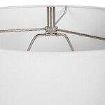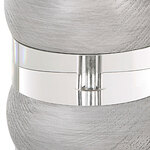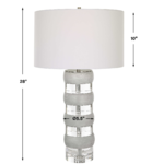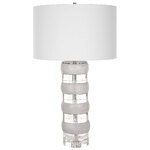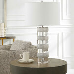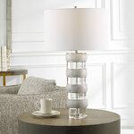 The Band Together Table Lamp displays a unique pairing of stacked thick crystal and bleached wooden discs, accented by brushed nickel plated iron details. The lamp is topped with a white fabric covered hardback drum shade. 3-way socket switch.