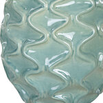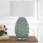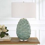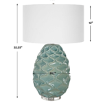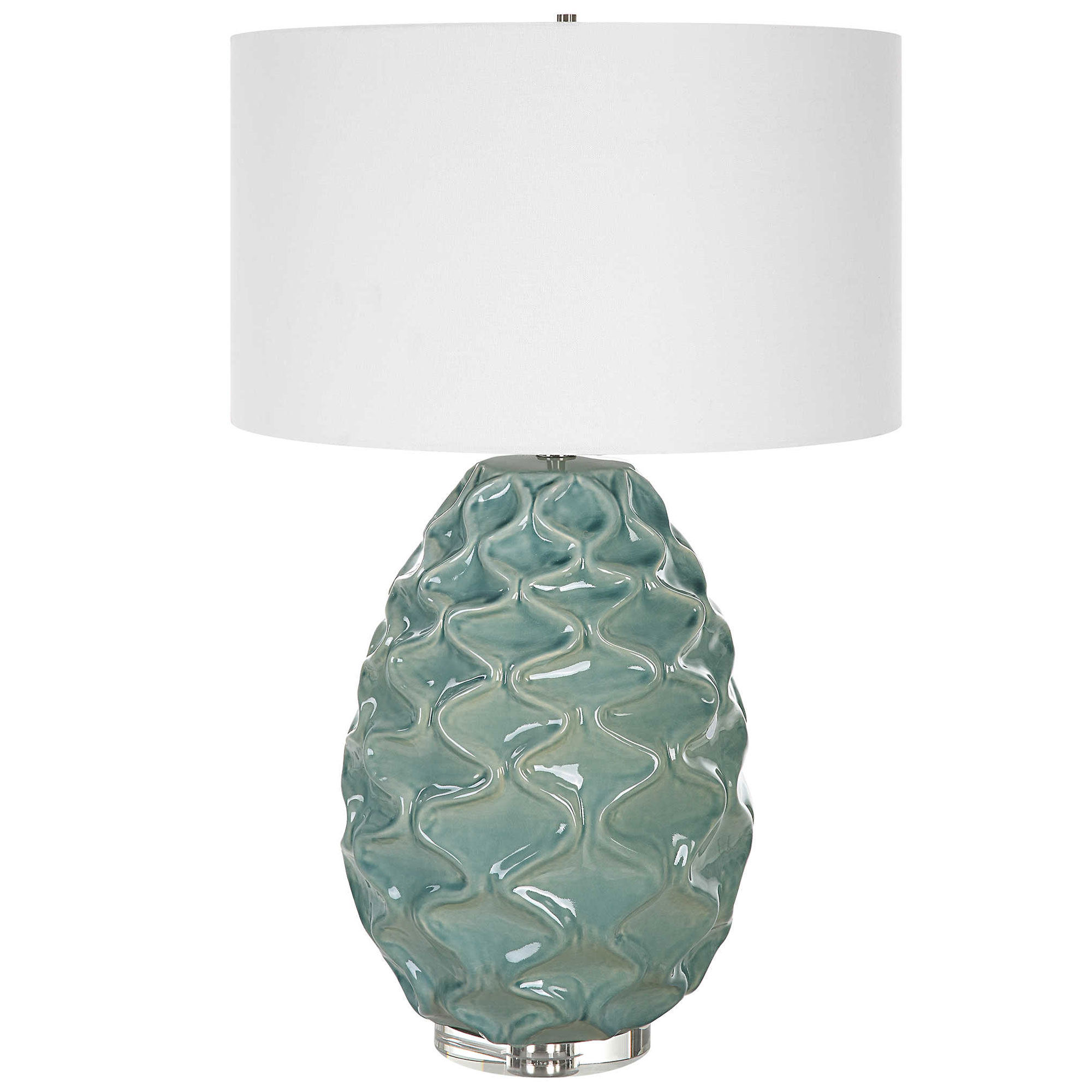 The Laced Up Table Lamp is handcrafted from ceramic with unique raised ribbon details in a sea foam gloss glaze atop a thick crystal foot. The lamp is complemented by a white linen drum shade. 3-way socket switch.