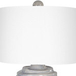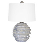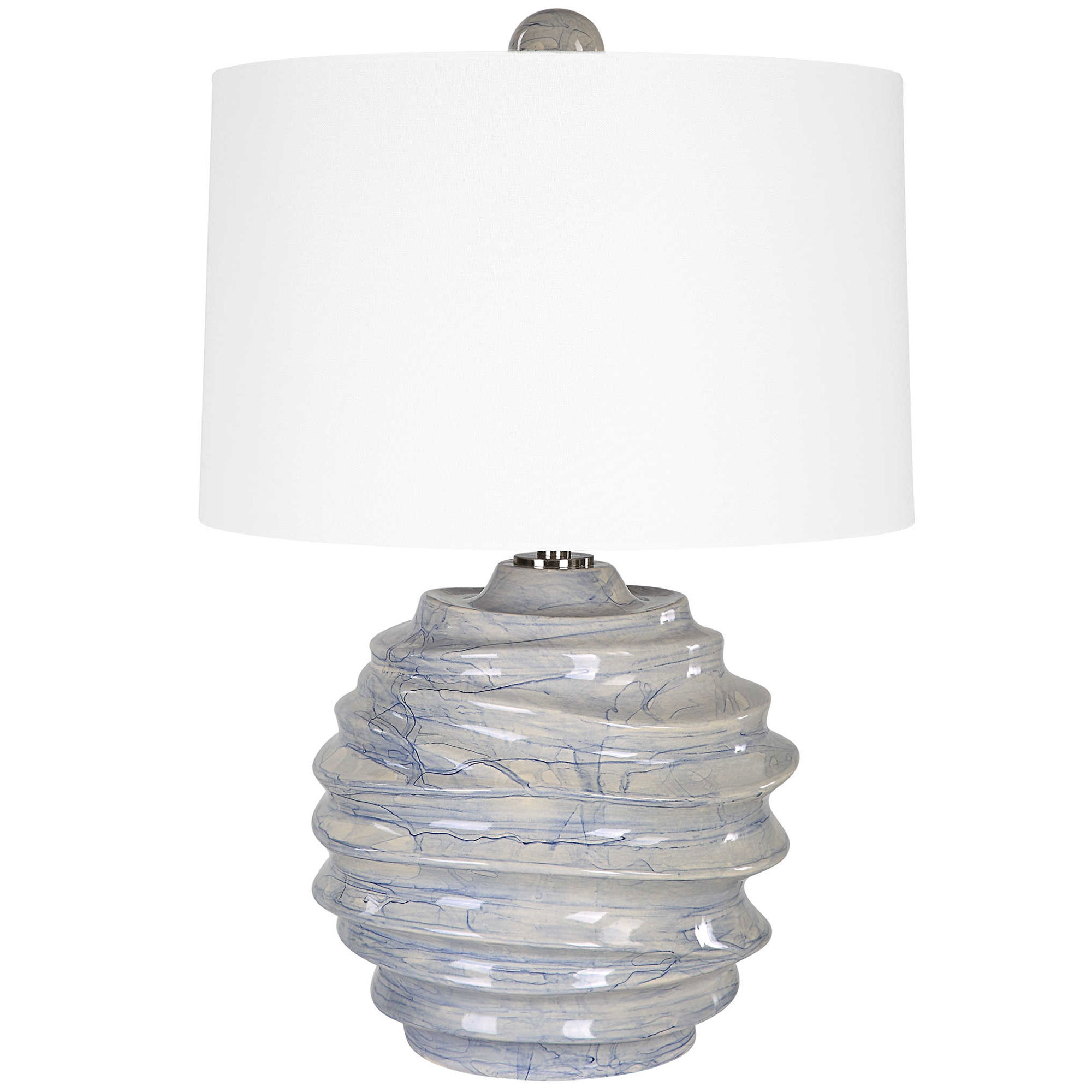 A contemporary take on classic blue and white ceramics, the Waves accent table lamp features a unique sculpted design with a hand applied light cobalt blue drip glaze and an oversized matching ceramic finial. The table lamp is paired with a crisp white hardback drum shade. 3-way socket switch.