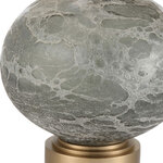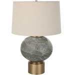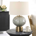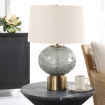 The Lunia Table Lamp showcases a beautiful, smoky gray art glass center with a textured surface, accented by antique brushed brass hardware. The tapered hardback shade is covered in a light oatmeal linen fabric with natural slubbing. 3- Way Socket Switch.