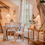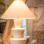The Kamas Table Lamp presents a bold, geometric look with its series of three stacked bowl shapes. Its light body finish is matched by the off-white linen shade and accented with Patina Brass hardware. Place this modern lamp on a console or side table to bring a clean, fresh feel to an entryway, bedroom and other living spaces.