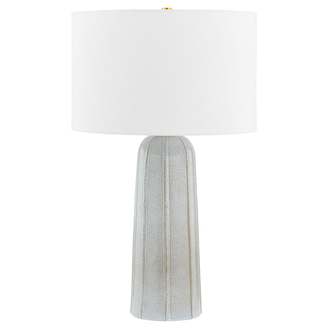 Celebrating the beauty of nature, the Kel Table Lamp blends rustic and refined elements. Recalling a sandstorm, the Reactive Ash Ceramic body has a raw, textural pattern. In contrast, the white linen shade floats like a delicate cloud. A glimmer of Aged Brass at the neck adds a flawless finish. On/off switch on fixture.
