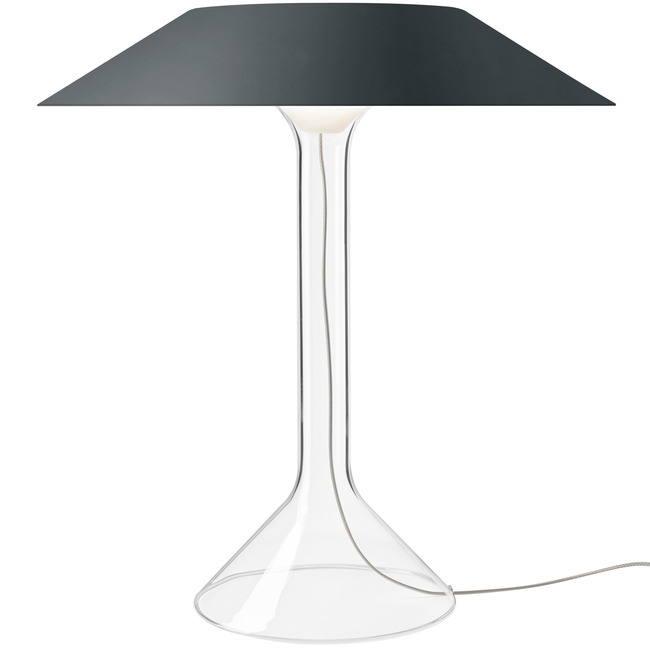 The Chapeaux M Table Lamp features a clear central body made of borosilicate glass with open ends, topped with a sleek steel hat shade. When the lamp is off, the transparent body almost vanishes, and reappears with a subtle presence when the light is on. An LED module sits inside the top of the glass, dispersing light radially through a polycarbonate shell to cast an intense yet soft glow onto your surfaces. The glossy white shade interior enhances light reflection.